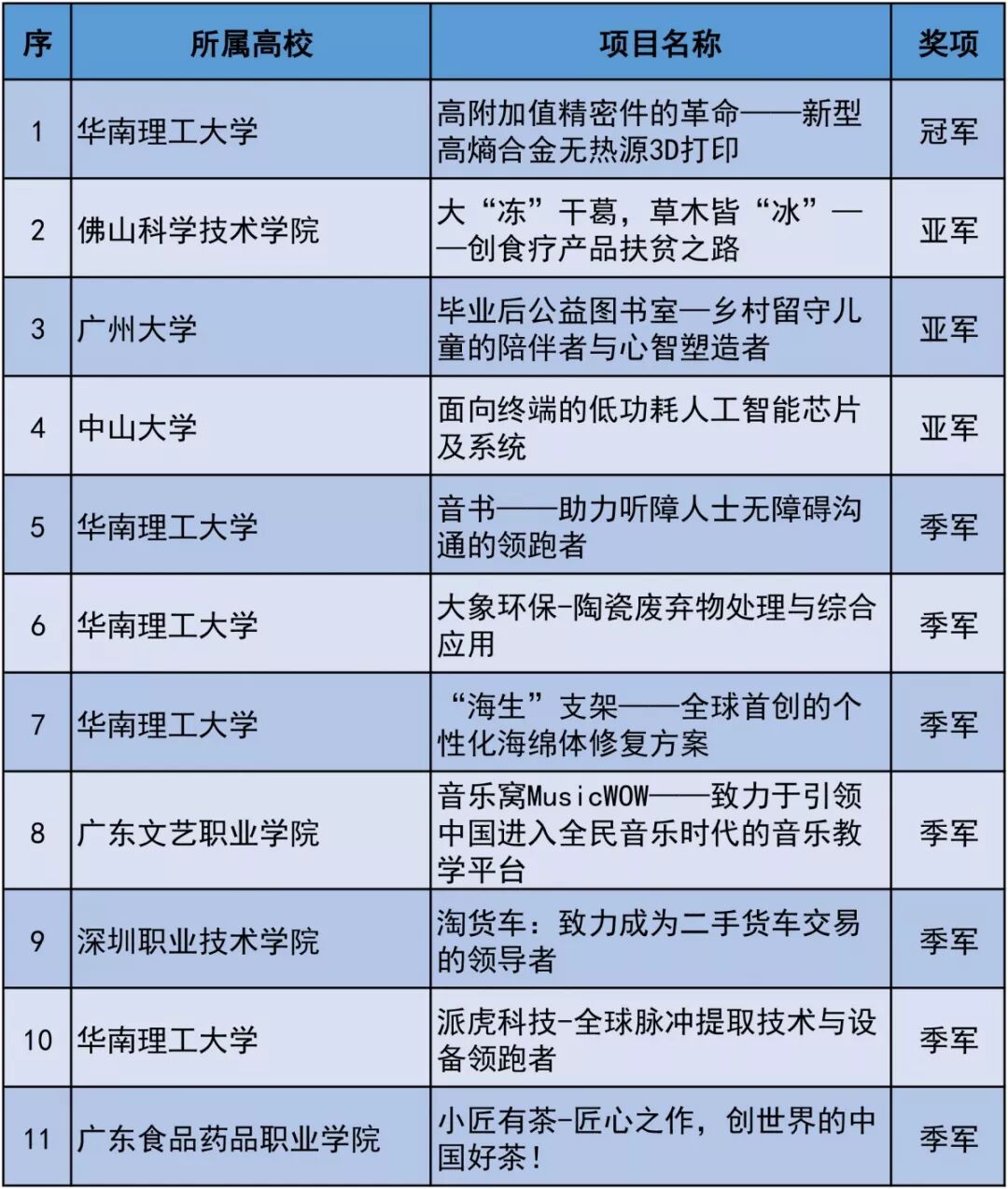 最终来自华南理工大学的“高附加值精密件的革命——新型高熵合金无热源3D打印”项目获得冠军,佛山科学技术学院 “大 ‘冻’干葛,草木皆 ‘冰’——创食疗产品扶贫之路”、广州大学 “毕业后公益图书室—乡村留守儿童的陪伴者与心智塑造者”项目、中山大学 “面向终端的低功耗人工智能芯片及系统”项目获得亚军。